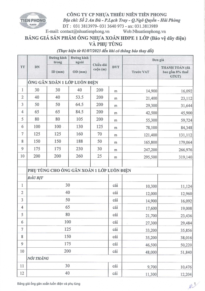 BÁO GIÁ ỐNG NHỰA GÂN XOẮN HDPE TIỀN PHONG